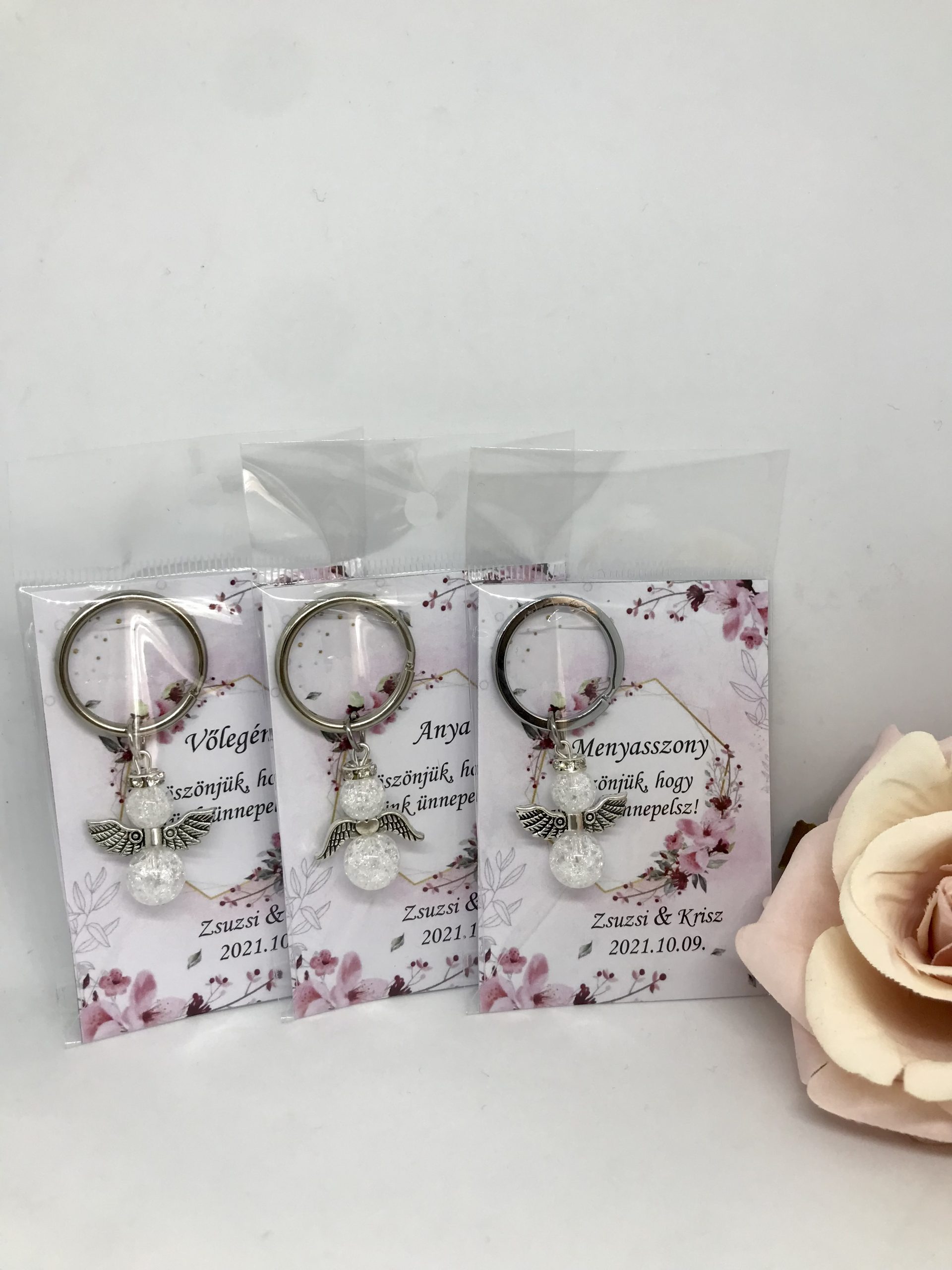 Egyedi elképzelés alapján készített esküvői köszönőajándék roppantott hegyikristályból, kulcstartókarikán.