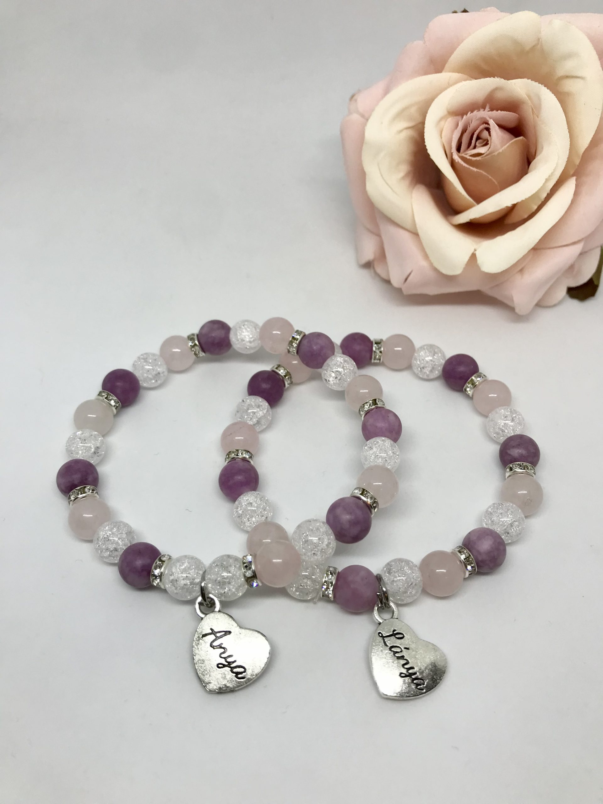 Különleges anya-lánya szett, lila jadeból, rózsakvarcból és roppantott hegyikristályból. A szett díszdobozban kerül kiszállításra.