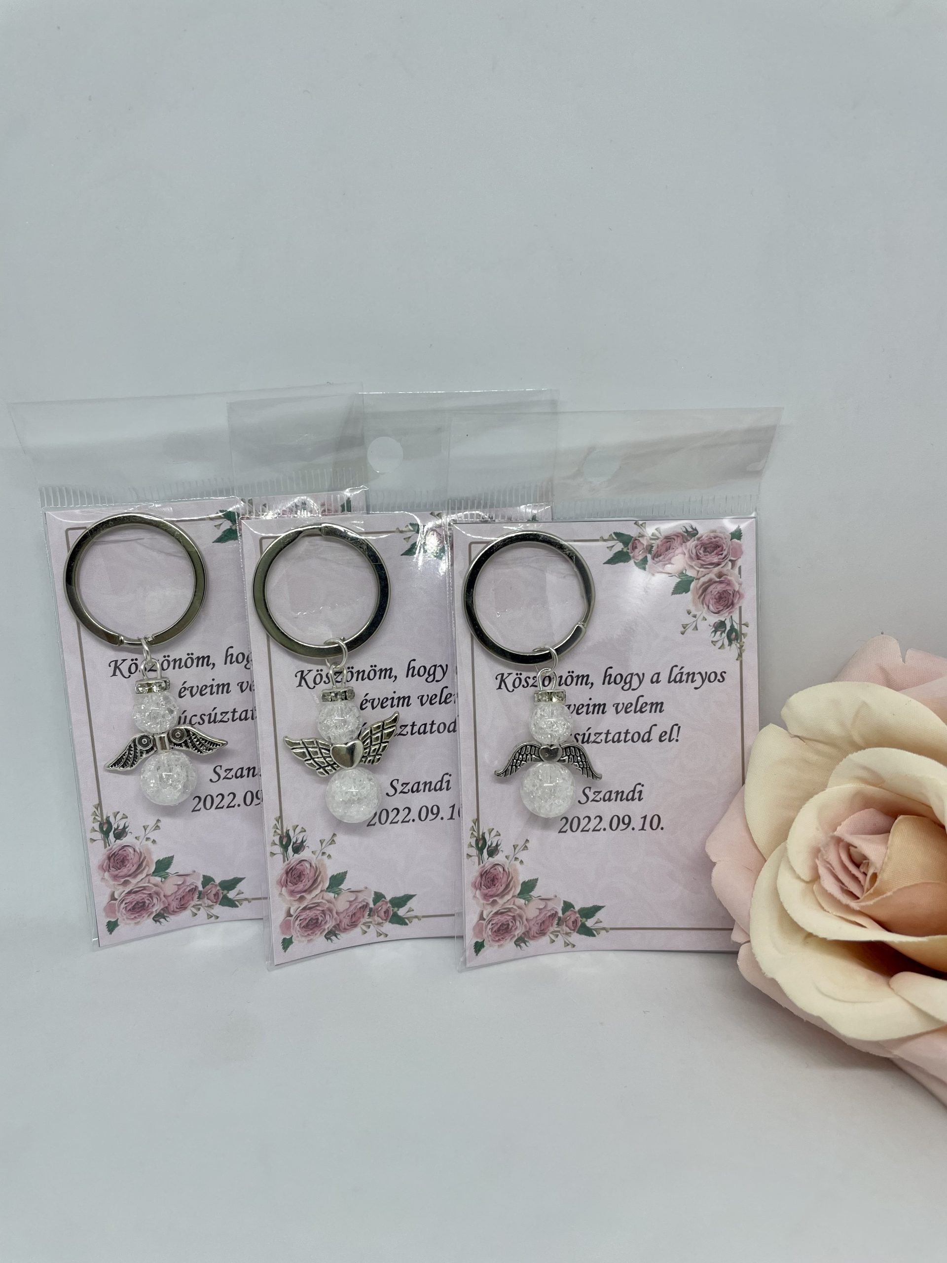 Egyedi elképzelés alapján készített lánybúcsús angyalka, roppantott hegyikristályból, ezüst angyalszárnnyal, kulcstartó karikán.
