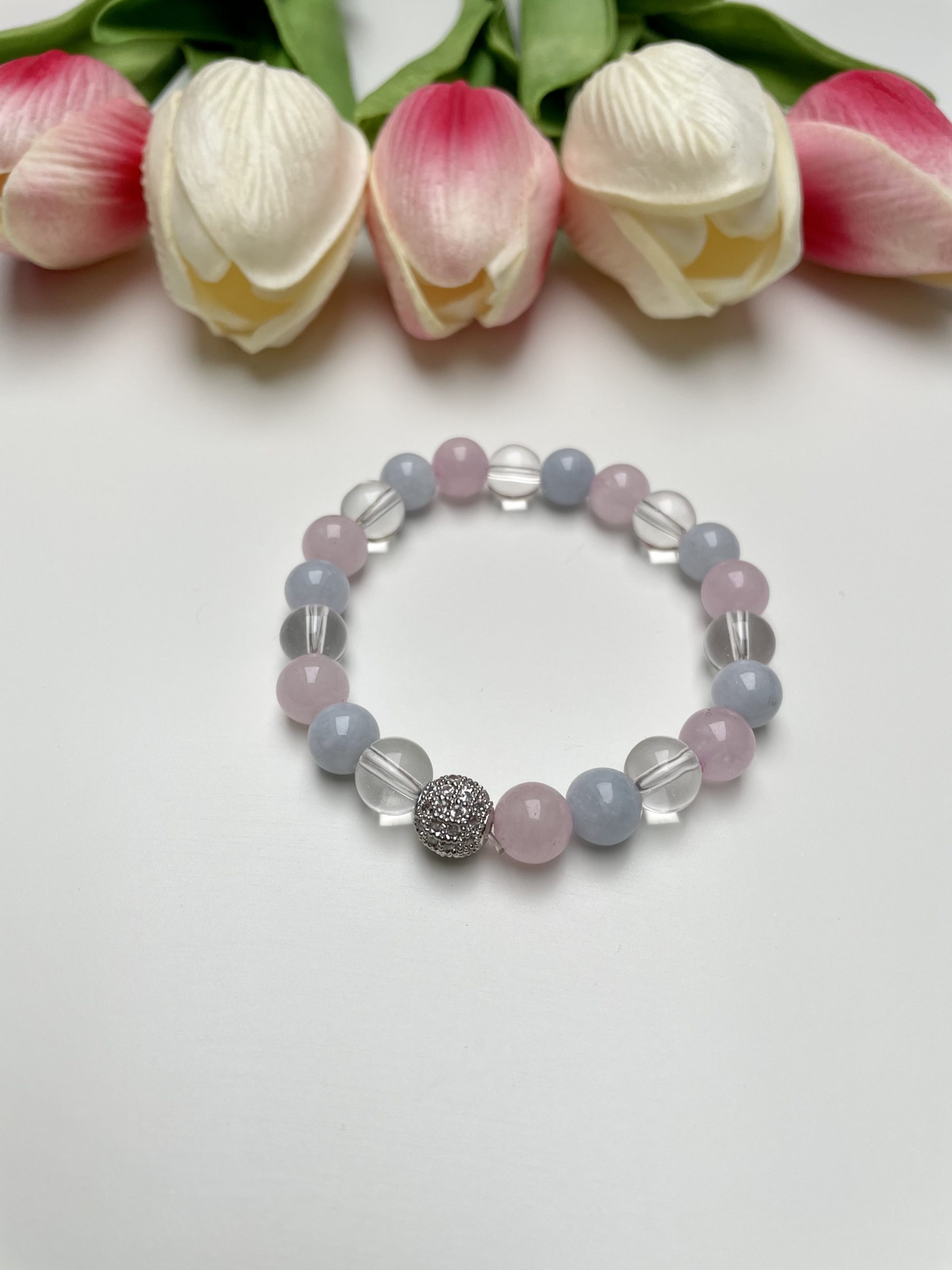 Akvamarin: Jelentése tengervíz. A bátorság köve. Védelmet és tiszta látást biztosít. felszabadít más emberek hatása és benyomása alól. Bátorságot és erőt sugároz, és megszabadít az áldozat mentalitástól. Támogatja az immunrendszert. Csökkenti az agressziót. Gyógyítja a légúti betegségeket. Csillagjegyei: Halak, Nyilas, Szűz, Mérleg, Vízöntő, Bika, Ikrek, Rák Hegyikristály: Sejtregeneráló, immunerősítő, idegrendszer nyugtató, méregtelenítő. Serkenti az agyi funkciókat és az anyagcserét. Egyensúlyban tartja a hormonháztartást és a vércukorszintet. Rózsakvarc: A rózsakvarc, a feltétel nélküli szeretet és a végtelen béke köve. Termékenységfokozó, nyugtató, kommunikációt erősítő, méregtelenítő, vesejavító, vérnyomás stabilizáló és bőrregeneráló. Figyelem! Viselés hatására elszürkülhet, kifehéredhet.