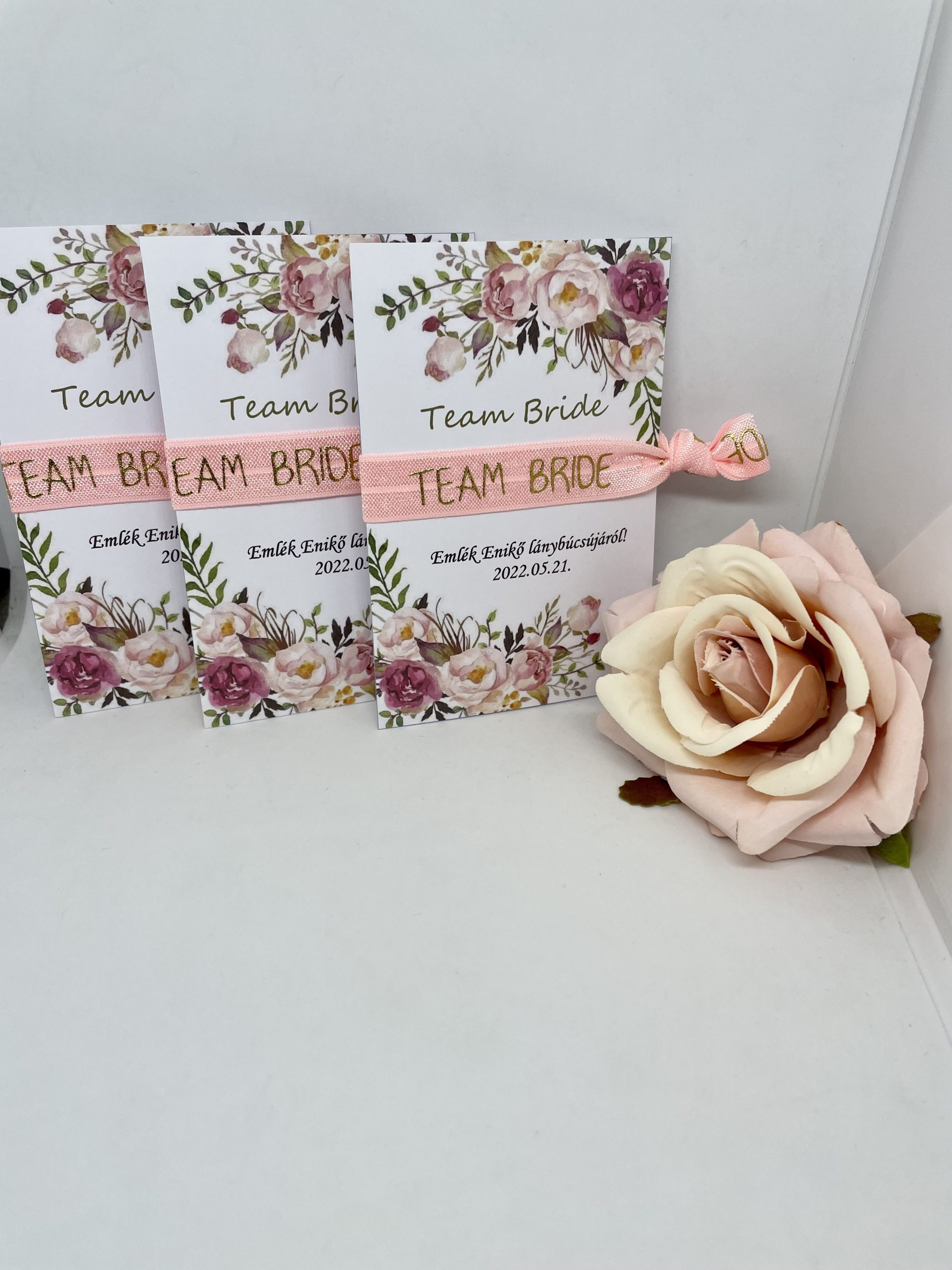 Különleges lánybúcsús egyen karkötő, barackvirág színű szalag, rose gold “Team Bride” felirattal, virágos kártyával.